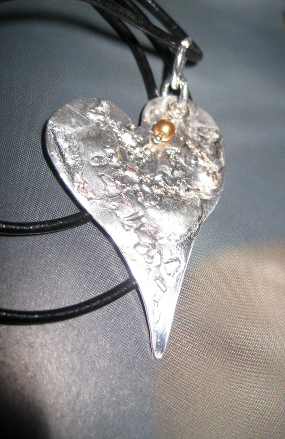 Håndsaget hjerte i ekte sølv i sort skinnsnor.