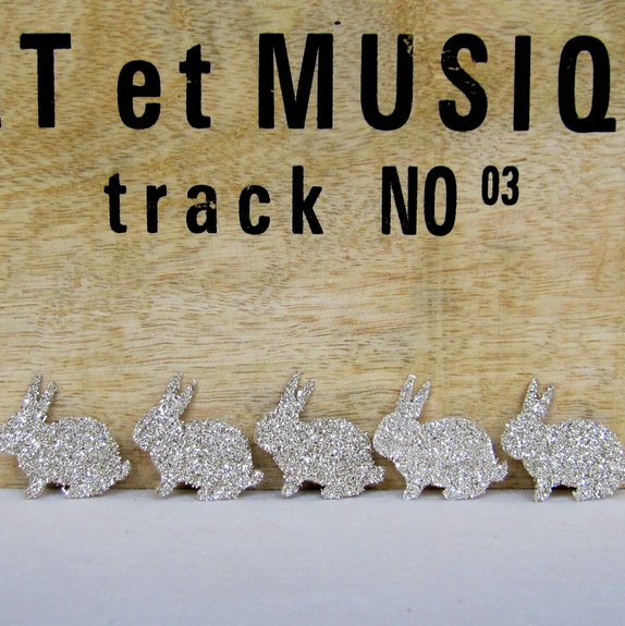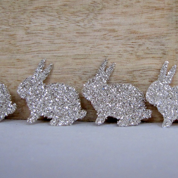 6 nydelige harer med sølv glassglitter, som er kjempefine til kortlaging, scrapbooking, dekorasjoner, påskepynt, gavepynt etc etc.
