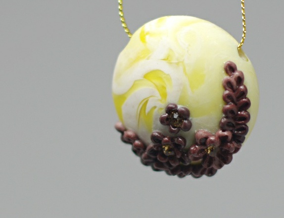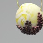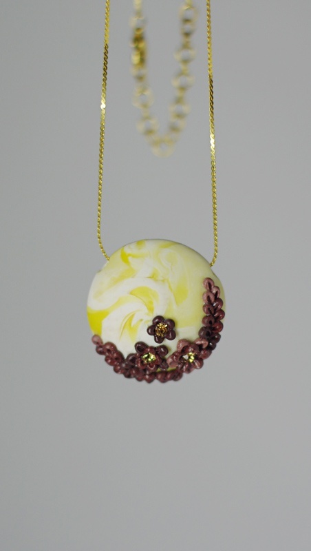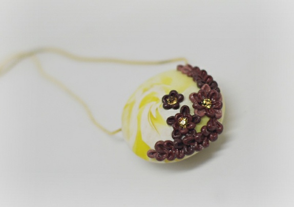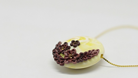 Kjedet er ca 40 cm (+6cm ekstra) langt. Anhenget er ca 3 cm i diameter.Laget av fimo leire og tre små "diamanter".