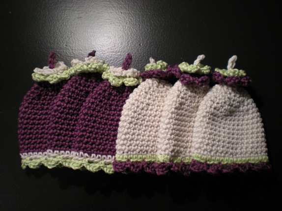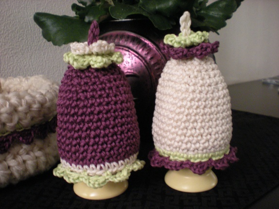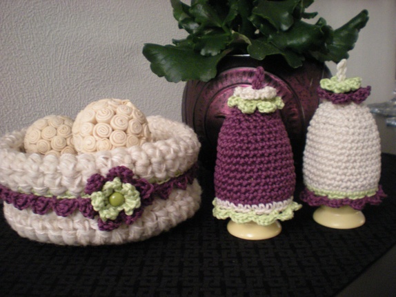 Tøffe heklede eggvarmere - Lilla med offwhite/vårgrønn kant og blomst