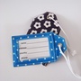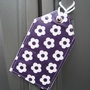 Søt koffertlapp i lilla med et mylder av hvite blomster. Koffertlappen er sydd i et plastbelagt bomullsmateriale med "vindu" i plast. Selve lappen er stivet opp med samme plast som er benyttet i "vinduet". På toppen er det festet en malje. Koffertlappen festes på kofferten med en snor i bomull.