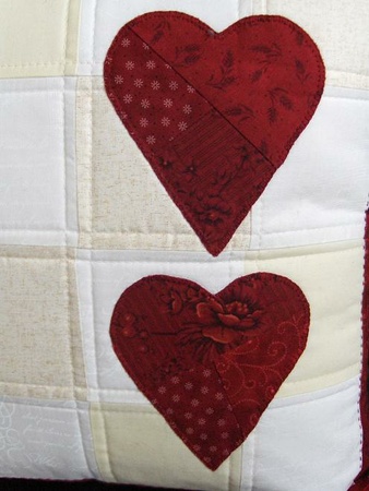 Quiltet putetrekk med applikerte hjerter. Bakside i hvit bomull med konvoluttåpning. Passer til puter i størrelse 40x40.
