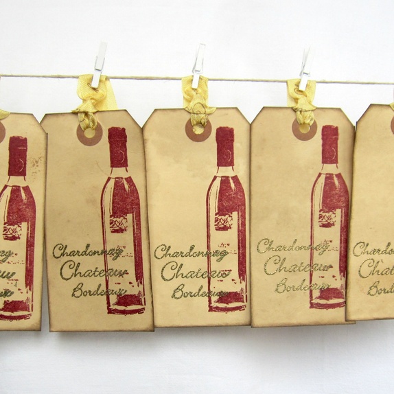 Lappene er dynket i kaffe og svertet i kantene for en "vintage look". Jeg har stemplet dem med en vinflaske i burgunderfarge og embosset "Chardonnay, Chateau, Bordeaux" i antikkgull. Gavelappene har gullfargede silkebånd påstemplet "Chardonnay".