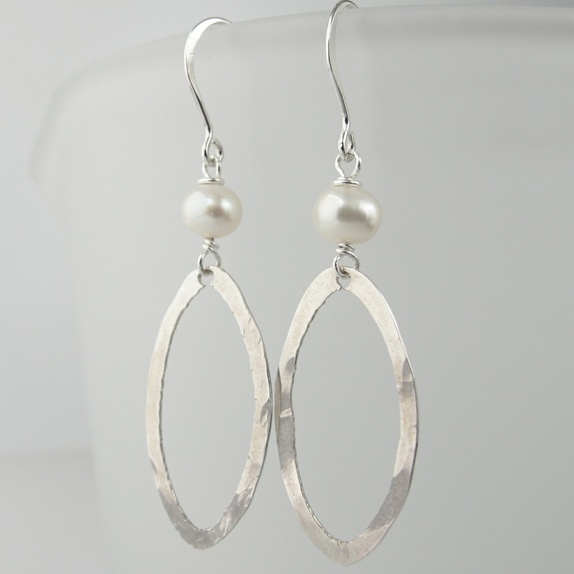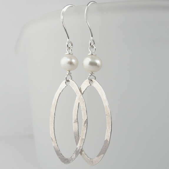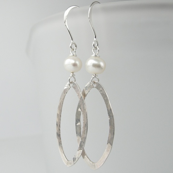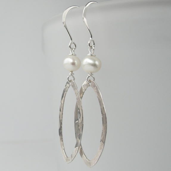 Dinglende øredobber, satt sammen av ørekroker, små hvite ferskvannsperler, og avsluttet med et par små sølvblader.