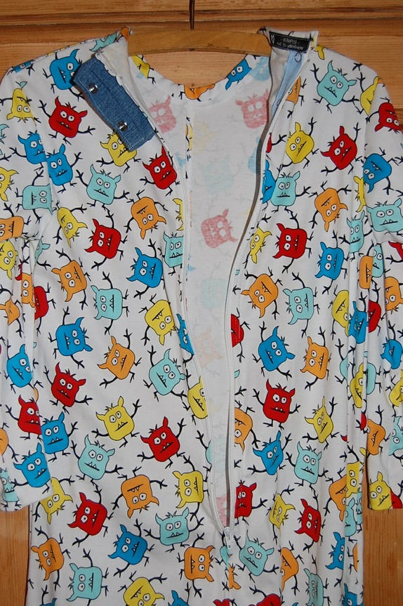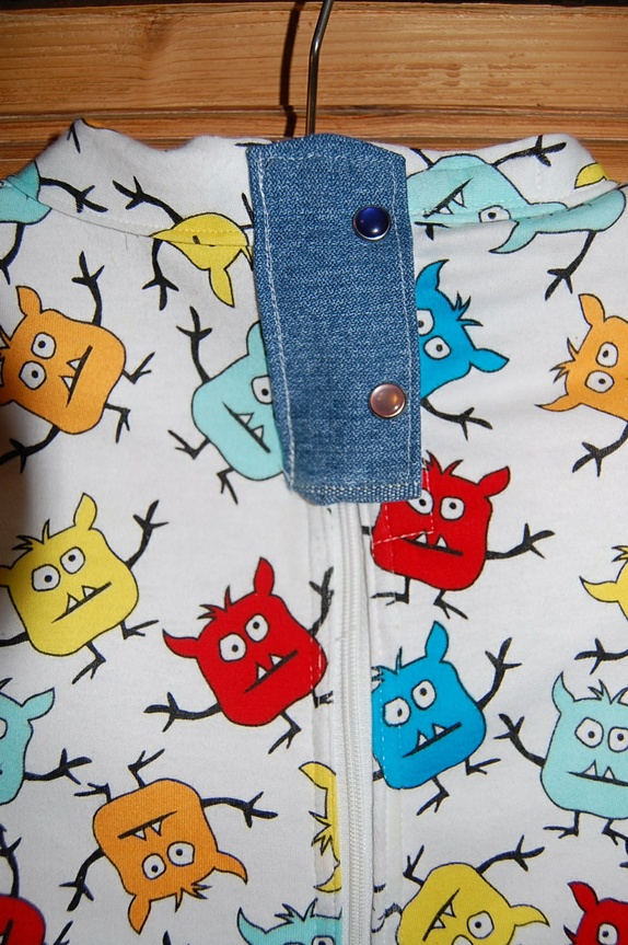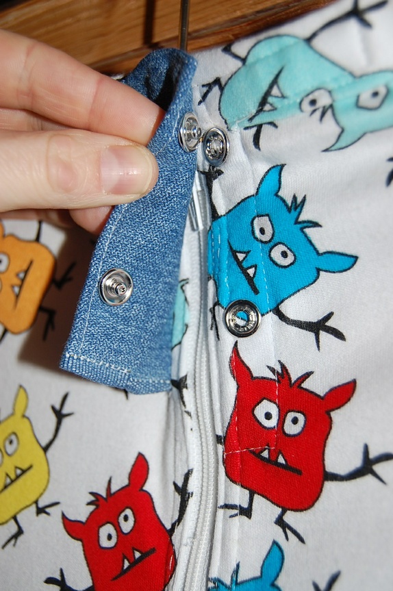Glidelås på ryggen med ekstra sikring i nakken slik at barn ikke skal klare å ta den av selv. Ingen skarpe kanter.