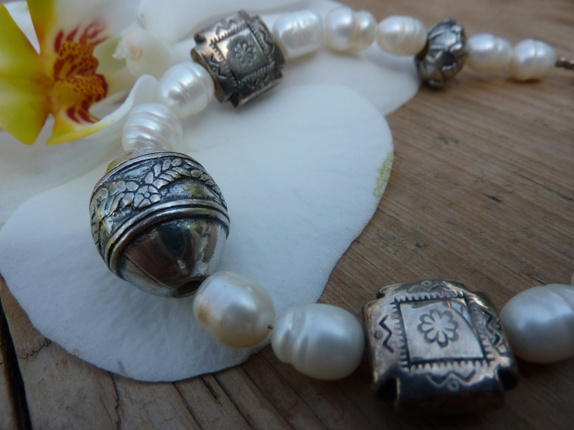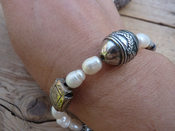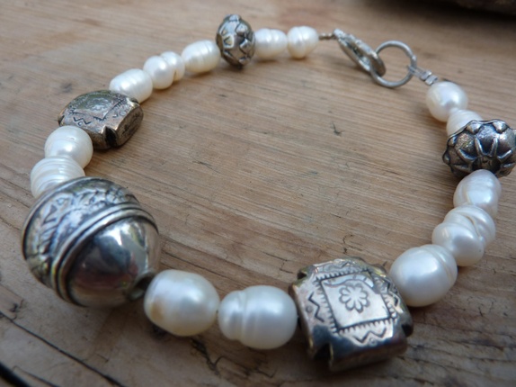 Armebånd med ferskvanns perler og mellomdeler i metall.Karabinlås.23 cm langt.Jeg kan justere lengden.