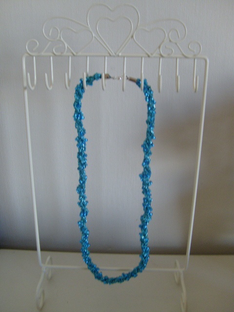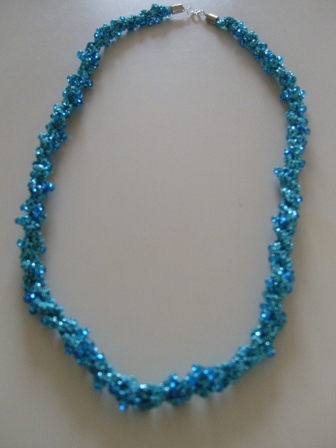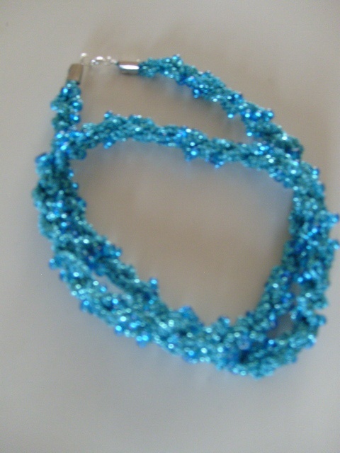 Smykket er heklet i et lekkert turkisfarget garn med skimmer og tvinnet. Samt at det har fått heklet inn 159 stk.glassperler i en nydelig blå farge.