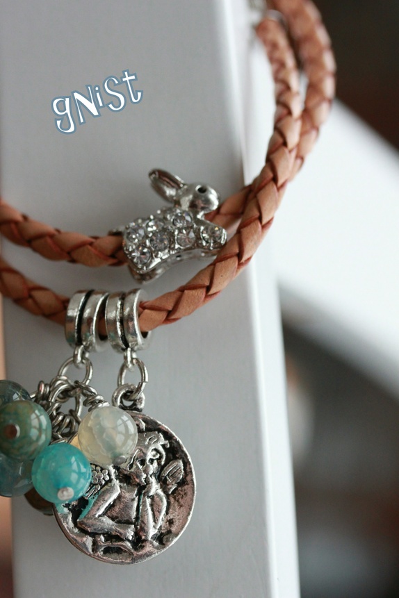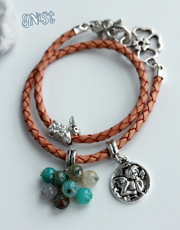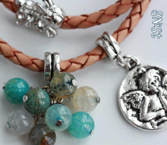 Perler av små dragevingeagat i nydelige farger - hovedsaklig aqua/turkis, en kanin og en engel som henger er satt på som pynt.