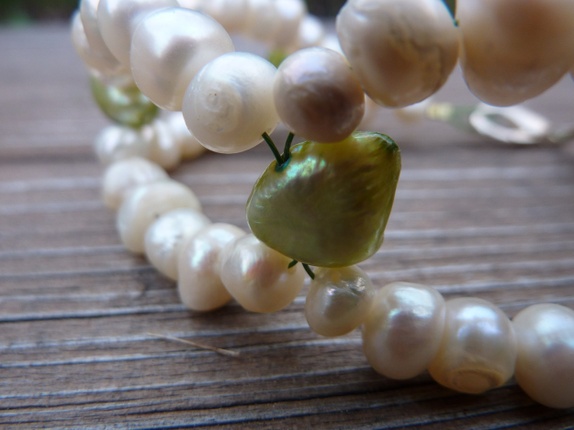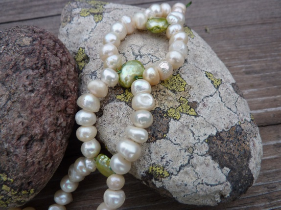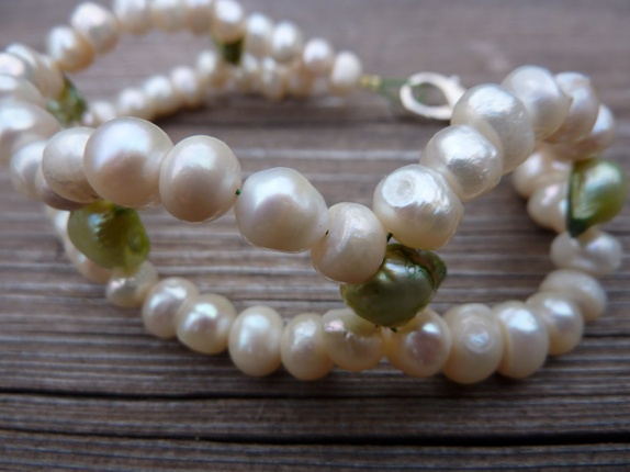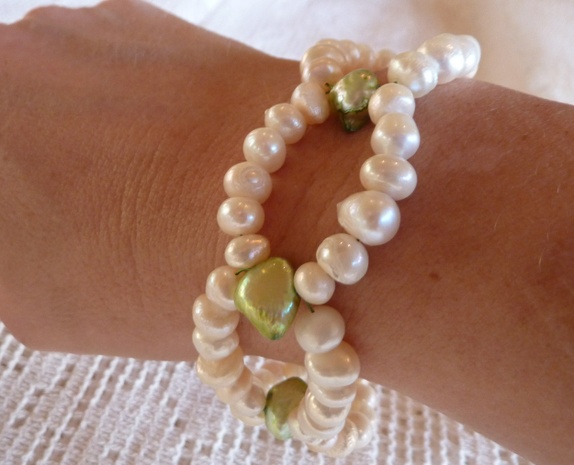 Armebåndet er lageav brønne og hvite ferskvanns perler som er tredd på en spesiell måte.Karabinlås.22 cm langt.Jeg kan regulere lengden.