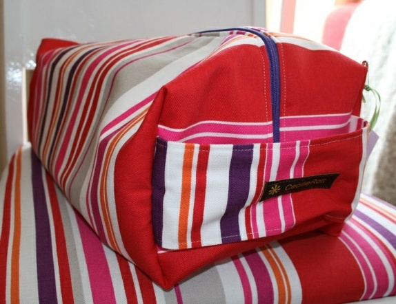 Strikkemappe med romdeler og hull til tråden, så kan du ha strikketøy i det enerommet og garn i den andre. Lukkes med glidelås og bæres i hanken. Enkelt å ta med seg og enkelt å rydde vekk.