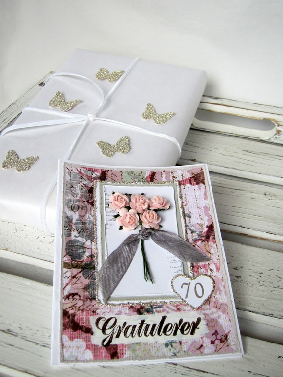 Det er pyntet med vakkert mønsterpapir, en rosebukett i lys rosa og sølv glassglitter. Tallet "70" er håndstemplet inni et hjerte som er kantet med sølv glassglitter. "Gratulerer" er håndstemplet med sjokoladebrunt blekk.