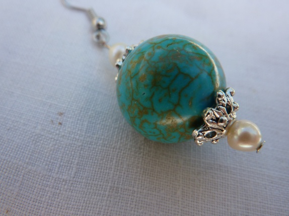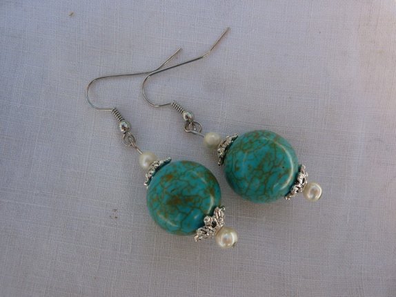 Ørepynt av nydelige store halvedelsten turkis og små ferskvannsperler. Diameter ca 1,5 cm.Lengde fra ørekrokene og ned er på 3,5 cm Ørekroker av sølvfarget metall.Nikkelfritt.Selger også halssmykke som passer sammen.