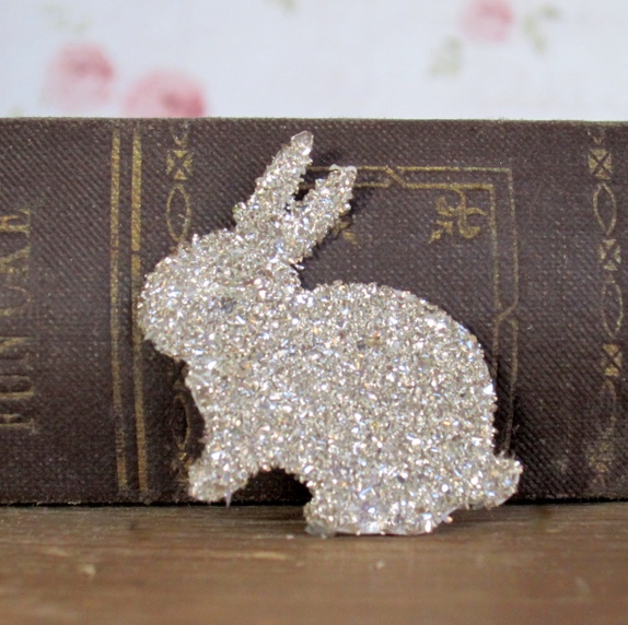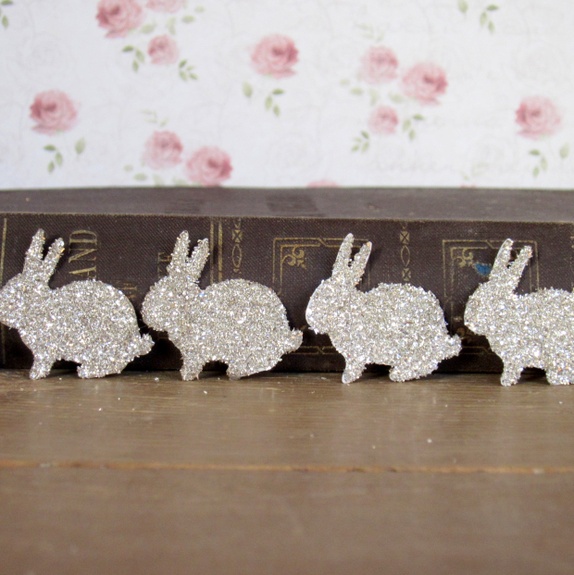 Dette er en pakke med 6 nydelige harer med sølv glassglitter. Figurene måler ca 2.5 cm.