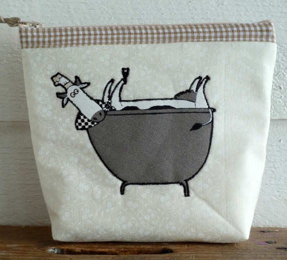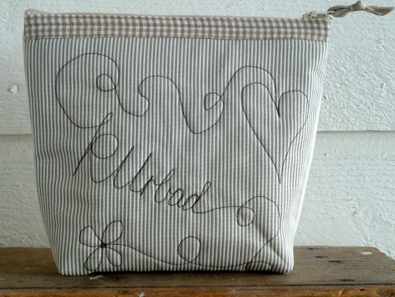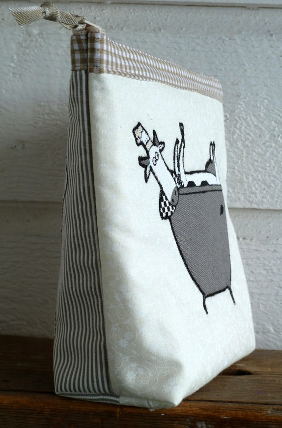 Toalettmappe laga i ulike bomullstoff.Motivet er applikert på.Mappa er vattert og fora i bomull.Frihandsquilta og frihandsbrodert på baksida.Høgd: 18 cm.Breidd: 21 cm.Botn: 6 cm.