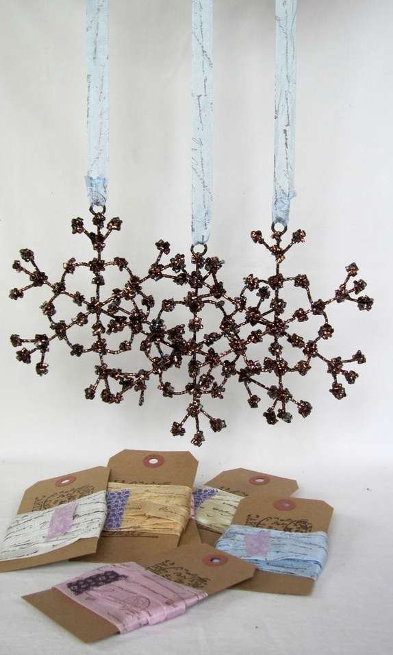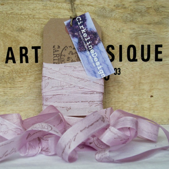 Båndet er håndstemplet i mørk brunt med et manuskriptstempel som gir et fransk shabby chic preg. Det egner seg kjempefint til f.eks. craft-prosjekter, scrapbooking, kortlaging eller til dekorasjoner med et shabby chic-preg.
