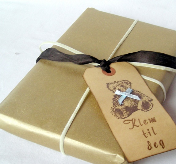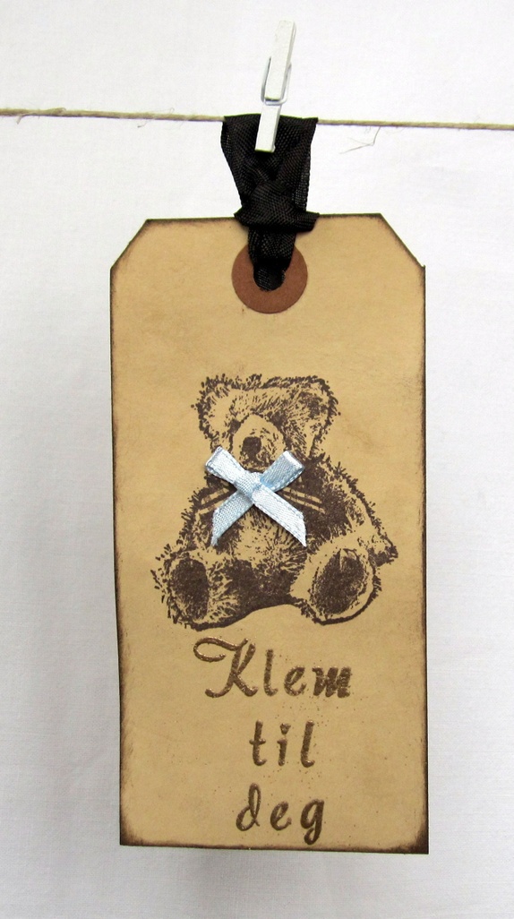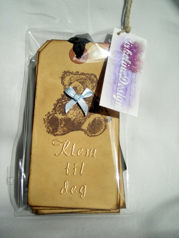 Gavelappene er farget med kaffe og svertet i kantene for en vintage effekt. Bamsefar er stemplet i sjokoladebrunt, og han er kledd opp med en lys blå tversoversløyfe. Teksten "Klem til deg" er embosset i gull. På baksiden av lappene er det stemplet "Til" og "Fra", og det er god plass til å skrive en personlig hilsen. Lappene har sjokoladebrune "silke"bånd.