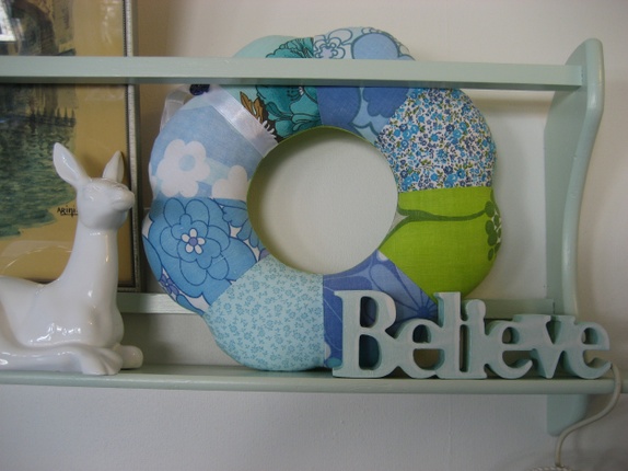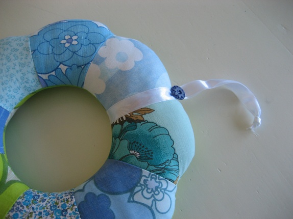 Både gamle og nye stoffer er brukt. Baksiden er et flott retrostoff i grønt, så kransen kan brukes på begge sider. Opphenget er et hvitt satengbånd, pyntet med en vintage blå knapp. Kransen er fyllt med bomullsvatt.