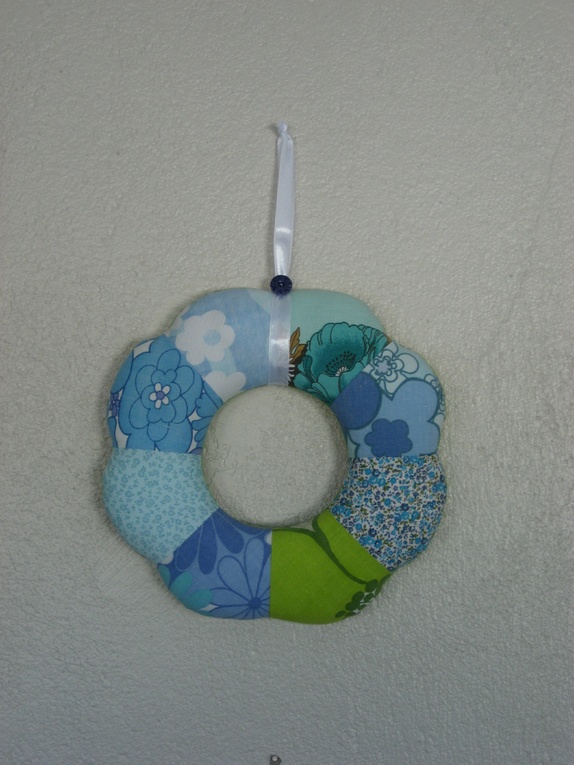 Jeg laget disse kransene første gang på 90-tallet sammen med moren min, da som julepynt, etter inspirasjon fra en hobbybok jeg desverre ikke husker navnet på. Ideen om å sy kransen i retrostoffer fikk jeg sist jul da jeg igjen tok fram kransen fra den gang.