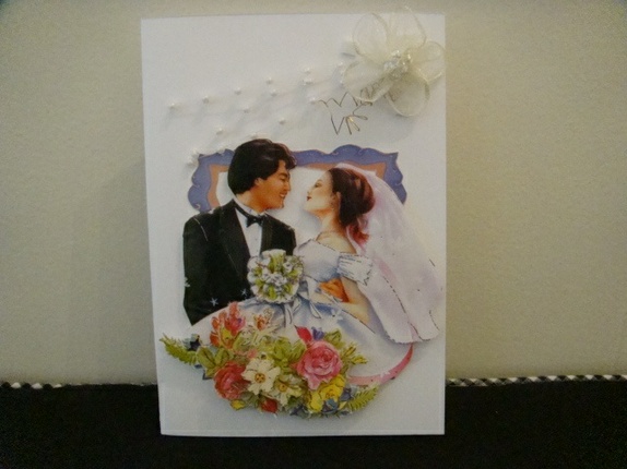 Kortet er preget og pyntet med perlepynt,metall tråd og silkeblomst. Konvolutt følger med.