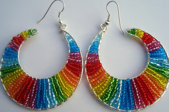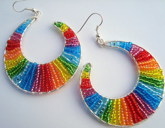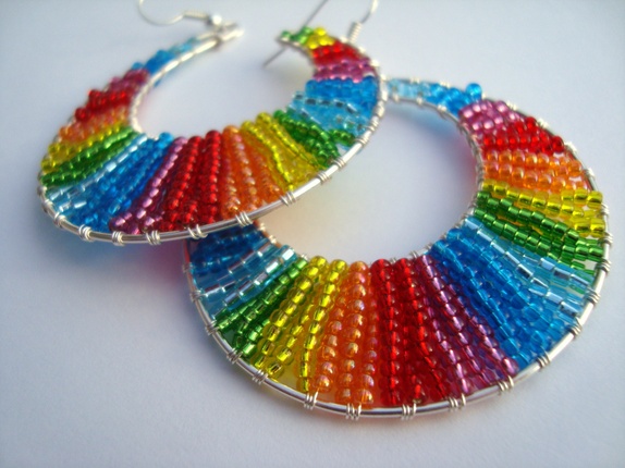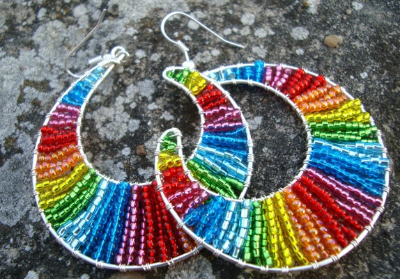Earrings are made from high quality silver plated copper wire, and laced with (japan) TOHO rokajl and (czech) rokajl in the shiny colours of the rainbow.