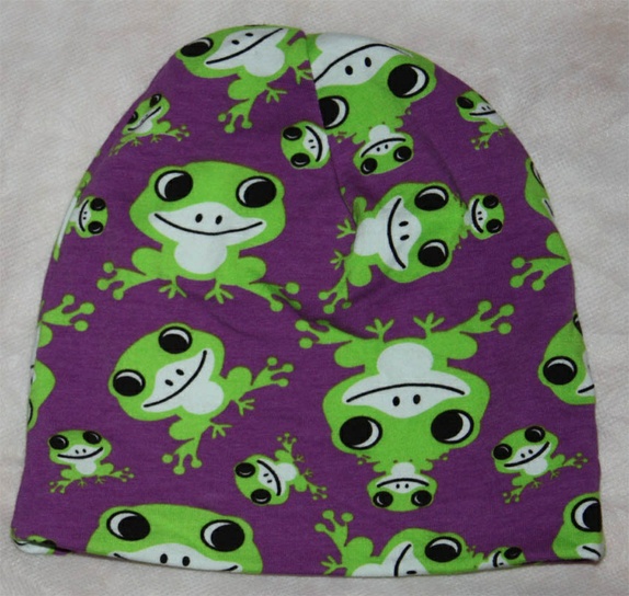 En tynn og deilig vår/høstlue i dobbel lilla jersey med søte frosker på. Kanskje blir det litt artigere å bruke lue når en har slik en søt lue...