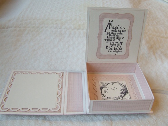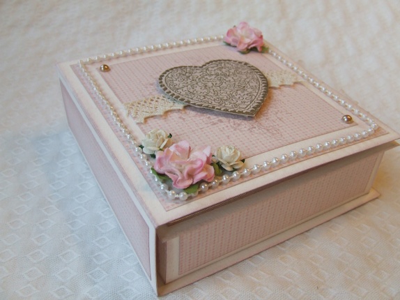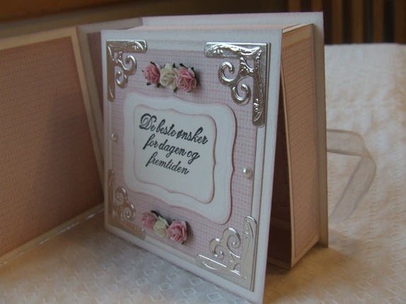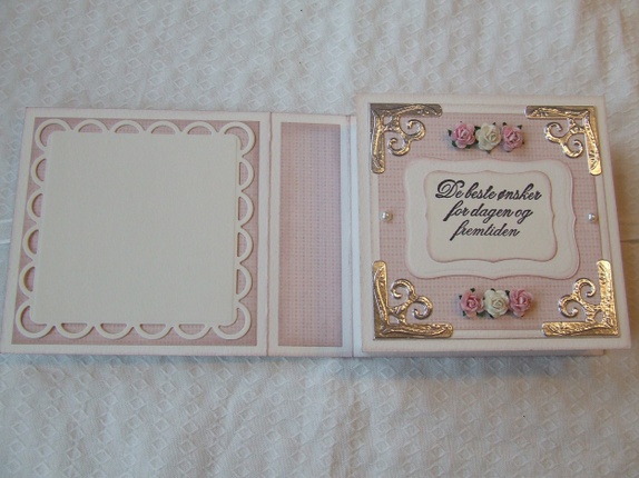 Pyntet med mønsterpapir, perlebånd, halvperler, roser, blonde, og stempel.