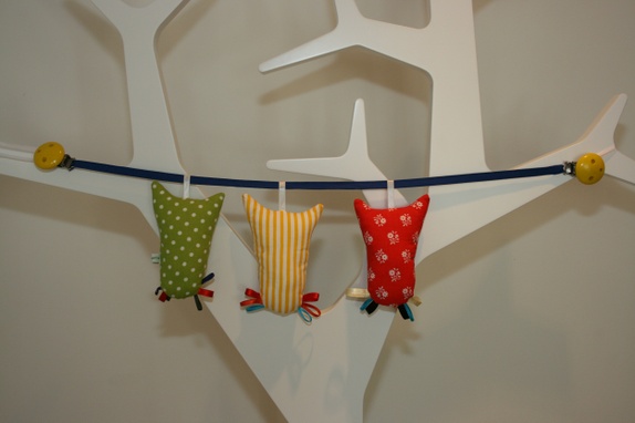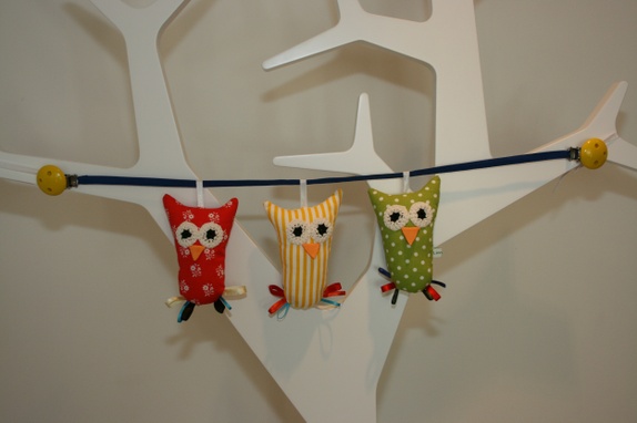 Tre kjekke ugler på ei snor.