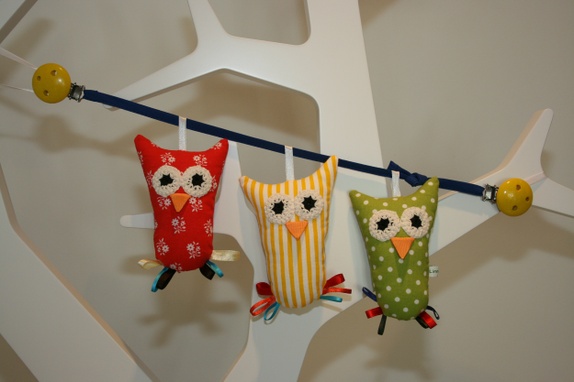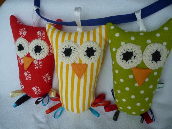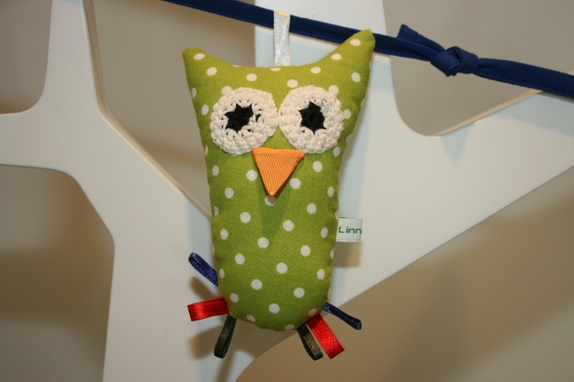 Laga i nytt og gjenbrukt bomullsstoff. Uglene har tydelege auge som appellerer til dei aller minste, føter av satengband til å fikle med når barnet er litt eldre, og bjelle som lagar ein svak lyd for dei som har lært å riste. Uglene er fylte med vatt.