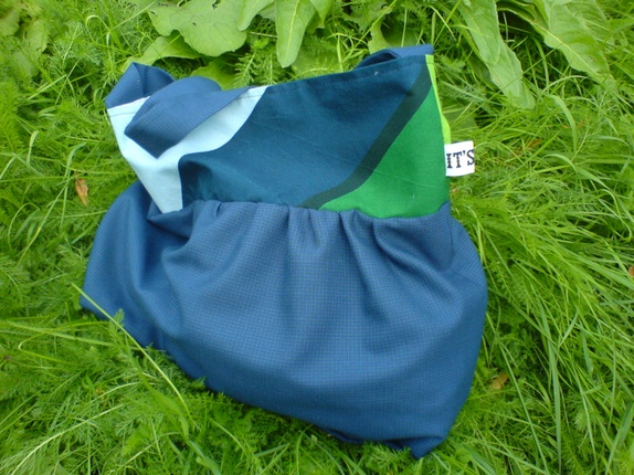 Mørkeblå smårutet veske med topp i retrostoff. Lysblå bomullsfor med 1 lomme. Magnetlås. Skulderlang rem. Bunnen, toppstykke og rem er forsterket med vliseline.