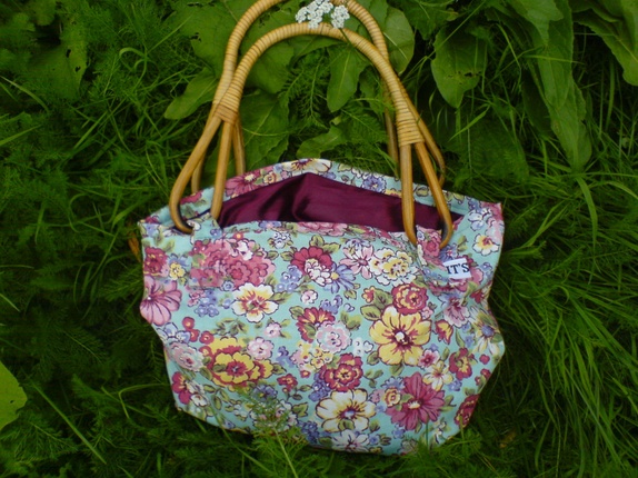 Blomstermønstret sommerveske. Kraftig bomull med burgunder polyesterfor. Bambushanker.