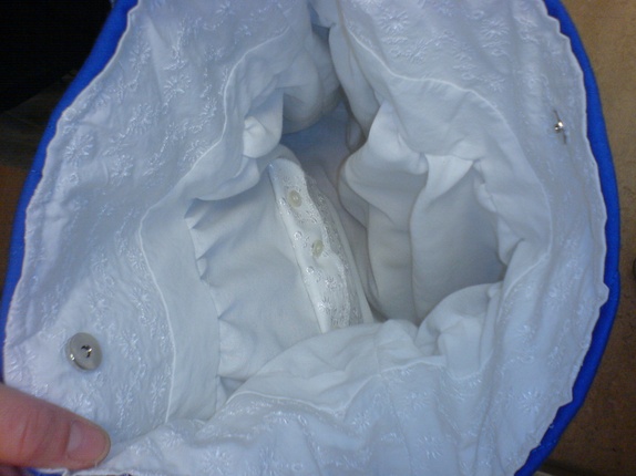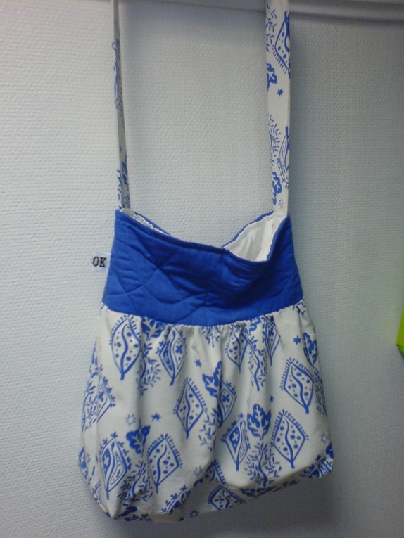 Veske i hvitt og blått retrostoff. Blå, quiltet "topp" på vesken. Forseggjort hvitbrodert innerfor med 2 små lommer. Magnetlås. Skulderlang stropp.