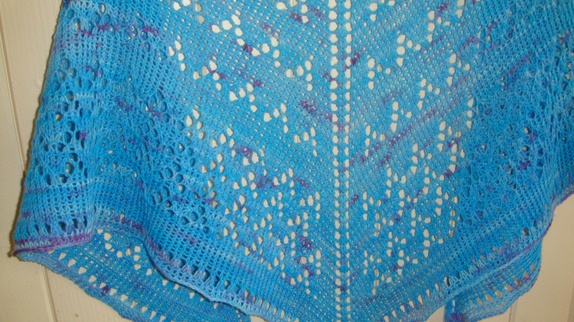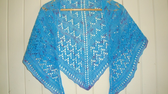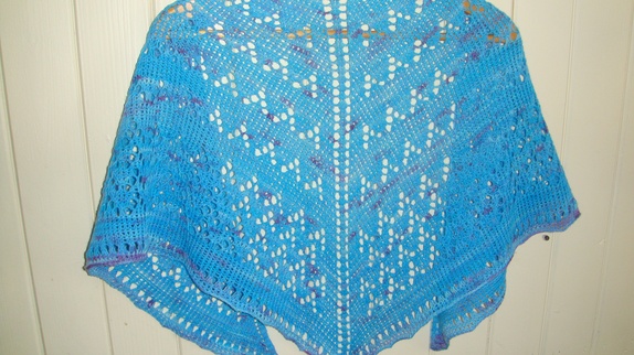 Sjalet er håndstrikket i håndfarget 100 % Merino ull.Det er strikket i turkis og blå/lilla nyanser.Og målene på sjalet er : Bredde, overkanten 140 cm fra spiss til spiss.Lengde midt bak fra topp til spiss er 58 cm. Håndvaskes Før 300,-