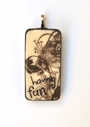 Dette anhenget består av en dominobrikke (2,5 x 5 cm)som er dekorert med forskjellige ting som feks papir utklipp, servietter og bånd for å skape en liten unik og dekorativ collage. Overflaten er beskyttet med dimensional lakk som gir dybde.