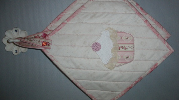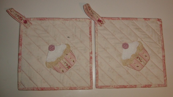 To quiltete grytekluter med håndapplikerte cupcakes. Størrelse: ca 20x20 cm.Farger: ulike rosatoner, overveiende gammelrosa, og beige
