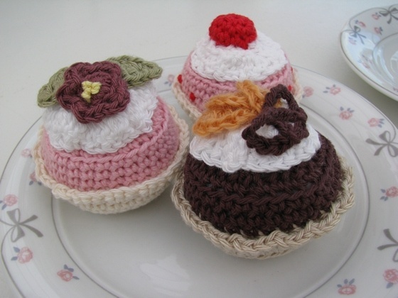 Skulle du få lyst til selv at hækle nogle lækre kager, har jeg opskriften du lige mangler:-)