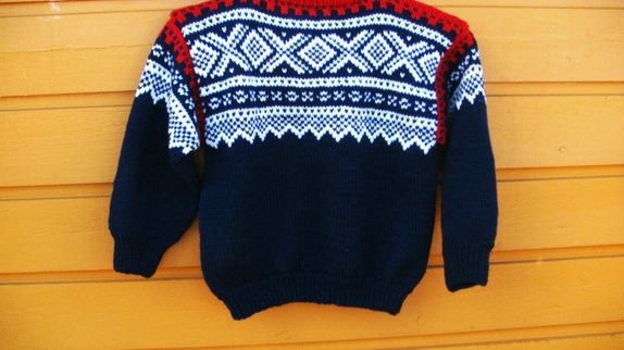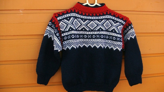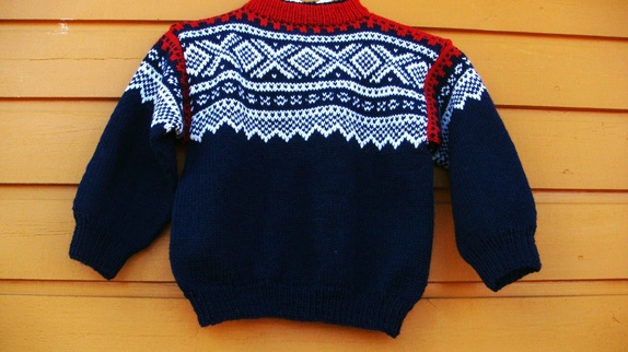 Mariusgenserern er håndstrikket i 100% ren ny ull. Hovedfargen er marineblå,noe som ikke kommer så godt frem på bildet. Størrelse 4 - 6 år Målene er : Overvidde 86 cm Erm lengde 36 cm Hel lengde 48 cm