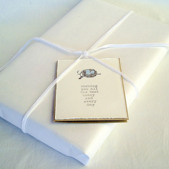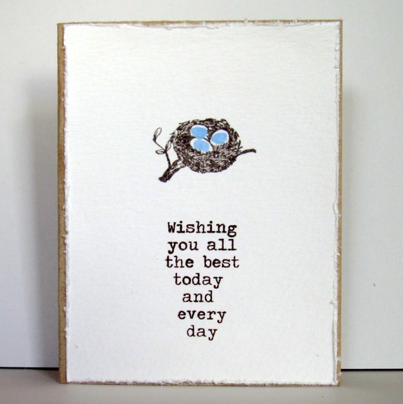 Kortene er dekorert med akvarellpapir med et håndstemplet lite rede med tre lys blå egg. denne teksten er håndstemplet under redet: "Wishing you all the best today and every day".