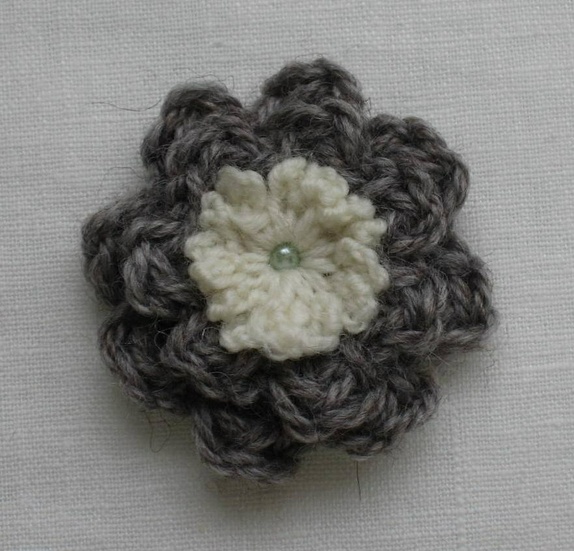 Heklet blomst. Grå og kremhvit med perle. Som avbildet.