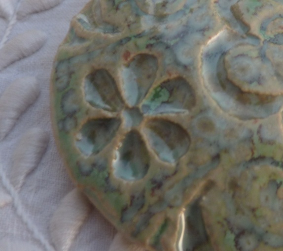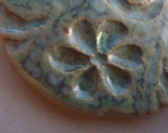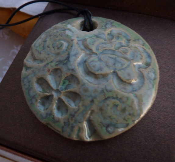 Halssmykke er laget av steingods som og har en diameter på 5,5 cm. Grønne nyanser.Sort lærsnor med regulerbar knute.