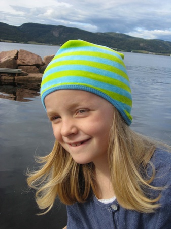Luen er sydd i en stripete chenille i turkis og grønn. Avslutningen på luen er kantet med en myk, turkis jersey. Luen finnes i 4 størrelser, XS, S, M og L.