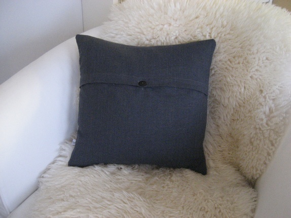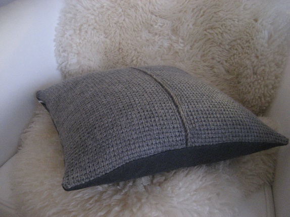 Putetrekk sydd om av en håndstrikket vest i grått ullgarn. Baksiden er et grått ullstoff.