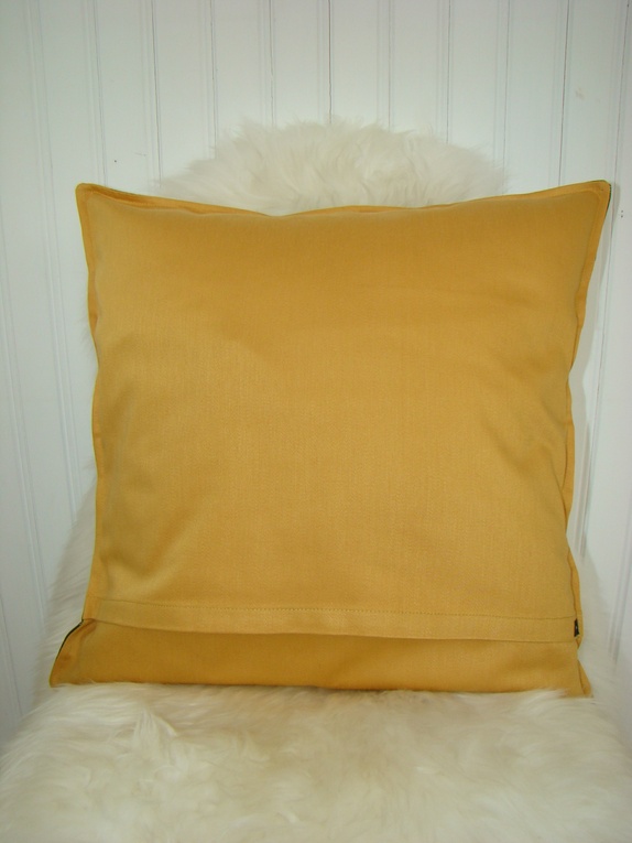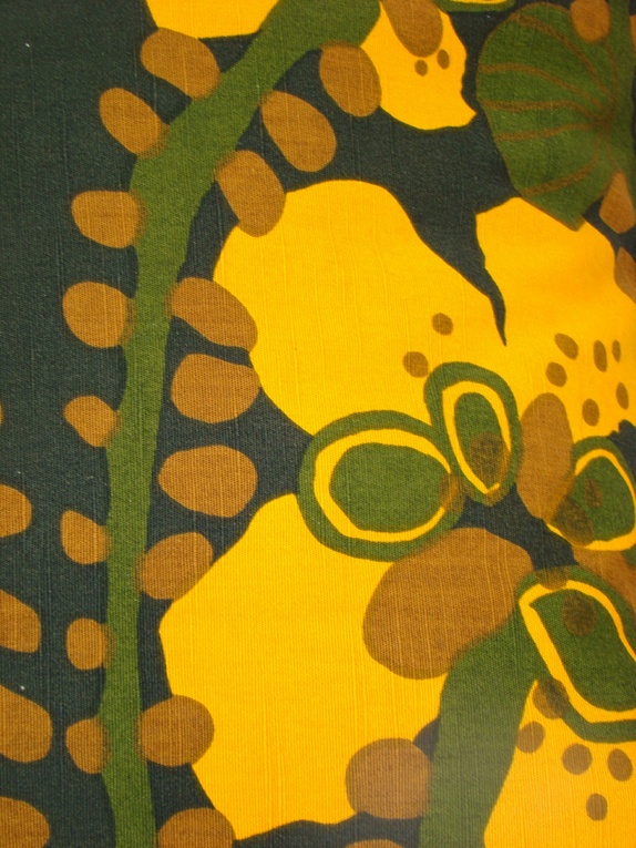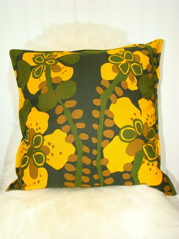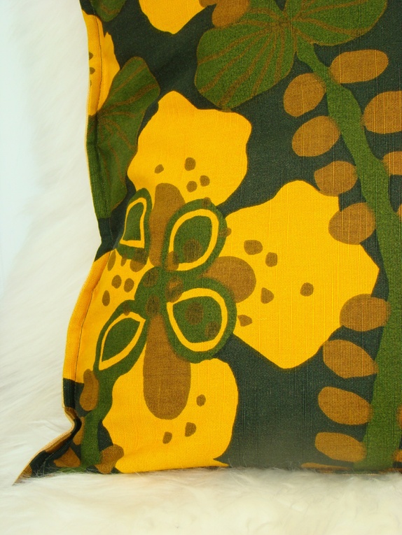 Putetrekk sydd i vintage stoff. Stoffet "Unikko" er fra Borås Tekstiler, designet av Saini Salonen. Baksiden på puten er i tykk, blank viscose i sennepsgult. Blomstene på stoffet er noe sterkere sennepsgul enn det som kommer fram på bildet.