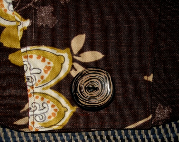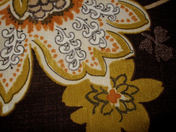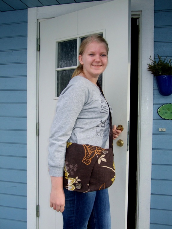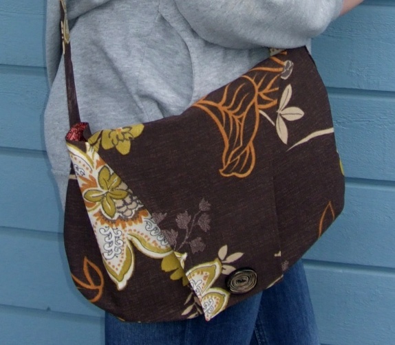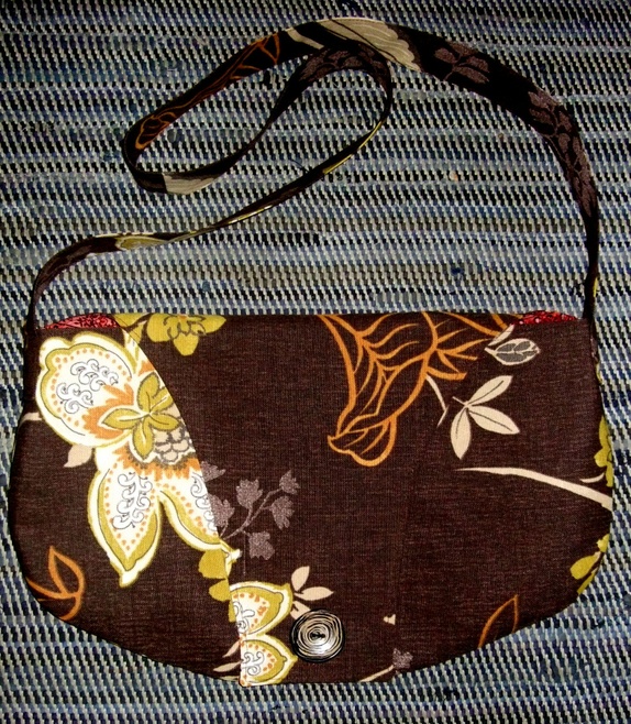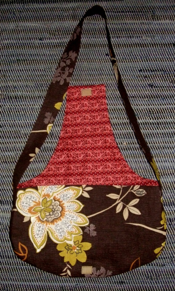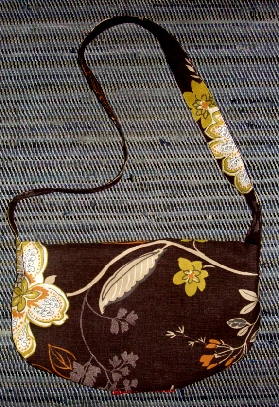 Enkel skulderveske sydd av kraftig brunt stoff med trykte blomster (25% bomull, 75% polyester).