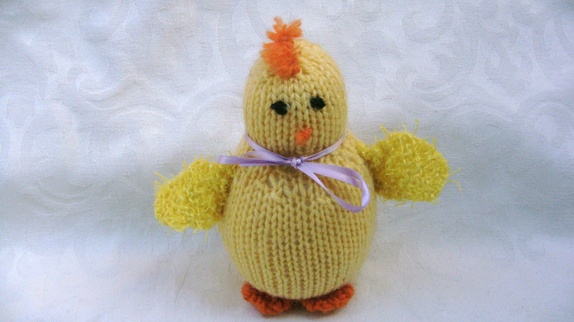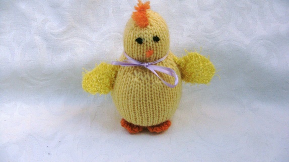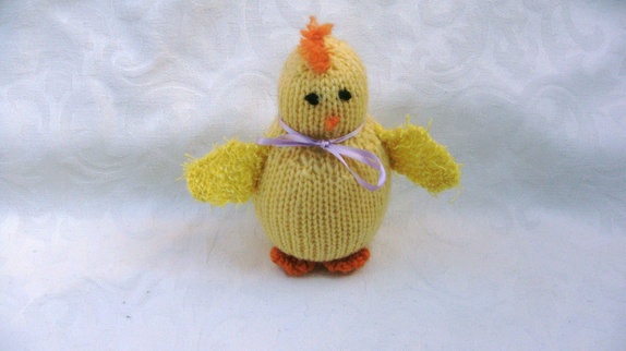 Den er strikket i babyull og effekt garn.Selv om øynene er brodert ,bør den ikke gis som kosedyr til barn.Siden nebb og kam ikke er sydd fast ,men knytt på kan det løsne under vilter lek.