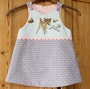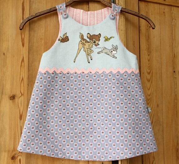 Søt, todelt Majakjole med Bambi på brystet, rosa kroklisse, og et grålilla bomullsstoff med mønster i blått og rosa på resten.