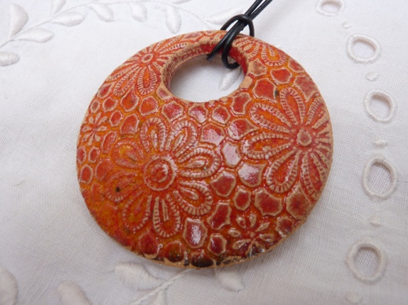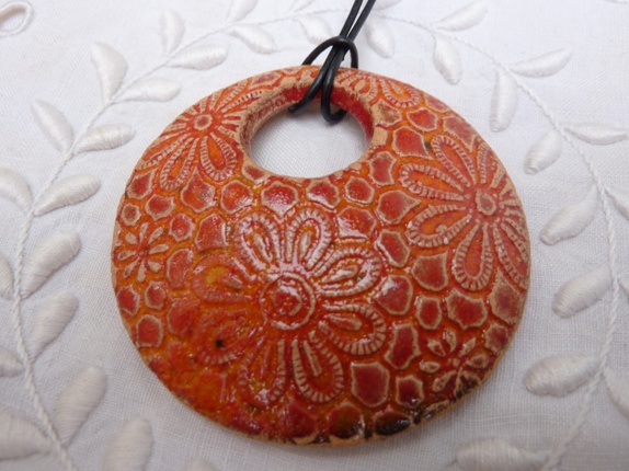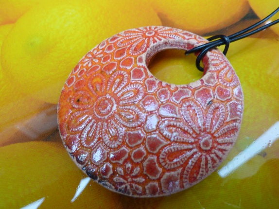 Halssmykke er laget av leirgods og har en diameter på 5,5 cm.Fin glans. Sort lærsnor med regulerbar knute.