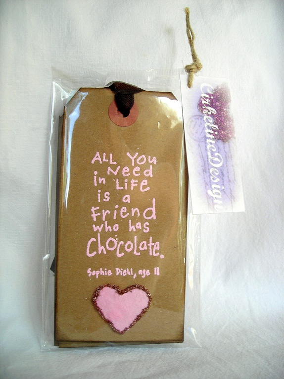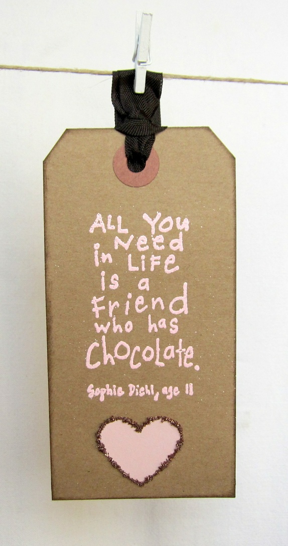Teksten på lappene er embosset (forhøyet) i sukkertøyrosa farge og lyder som følger: "All you need in life is a friend who has chocolate". Kantene er svertet for en "vintage look". Nederst er det et rosa hjerte med brunt glassglitter rundt. På baksiden av lappene er det stemplet "To" og "From", og det er plass til en personlig hilsen. Gavelappene har sjokoladebrune sløyfebånd.