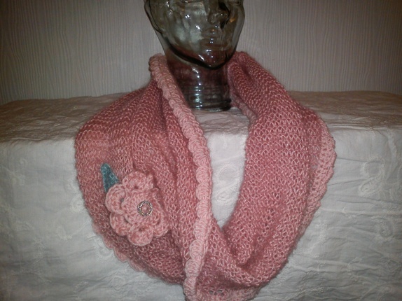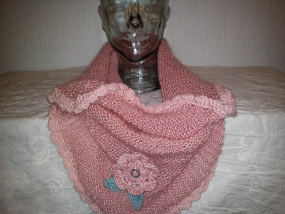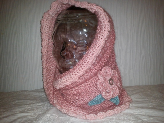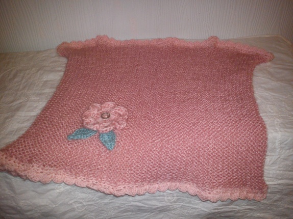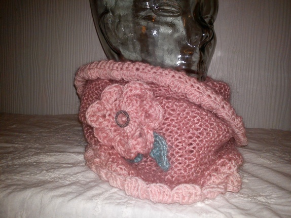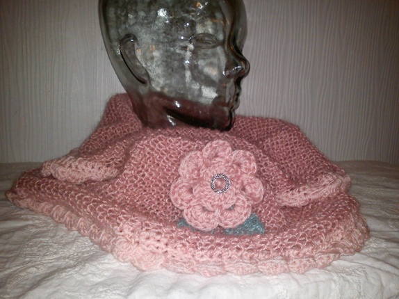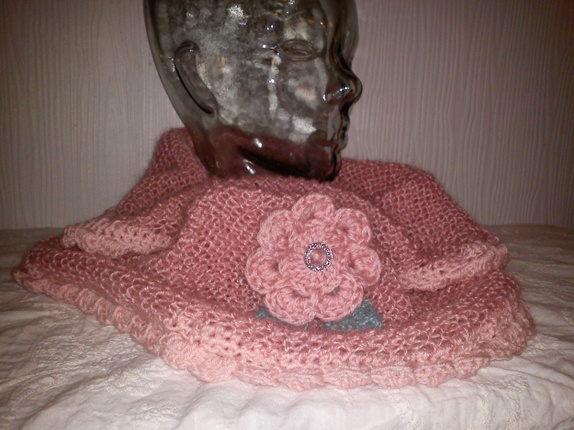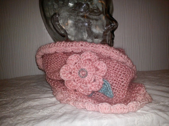 Denne er strikket i tynt mohair garn som holder varmen,samtidig som at den ikke blir for stor og klumpete, rundt kanten er det heklet blondekant i babygarn og pyntet med heklet blomst med blad og en glitter knapp.