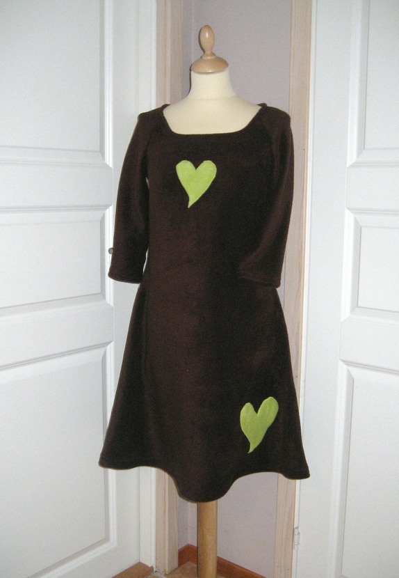 Herlig lun kjole i brun polarfleece med 3-kvart ermer. Kjolen er pyntet med 2 hjerteapplikasjoner i limegrønn fleece.