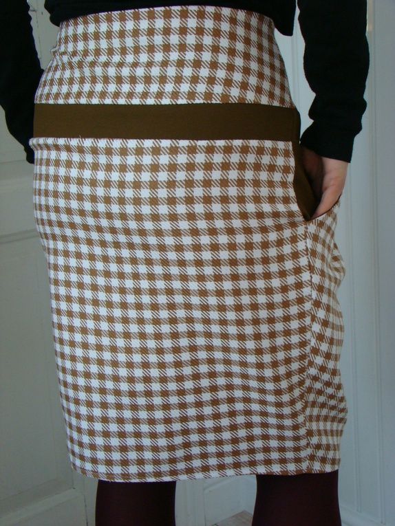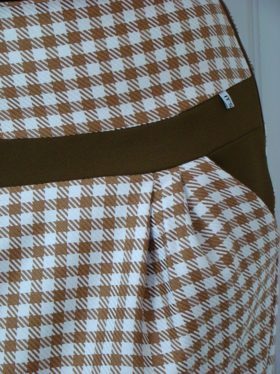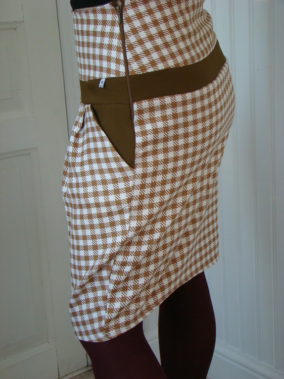 Ballongskjørt sydd av vintagestoffer. Brun- og hvitrutet viscosestoff i myk, blank kvalitet. Brunt polyesterstoff i midjen. Lommer. Gildelås i siden.